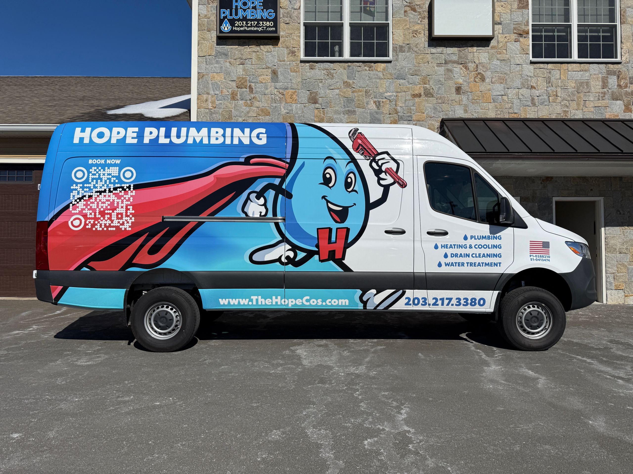 A white 'Hope Plumbing' service van with a large, colorful graphic of a blue water drop mascot holding a red pipe wrench is parked on a snowy suburban driveway. A white 'Hope Plumbing' service van with a large, colorful graphic of a blue water drop mascot holding a red pipe wrench is parked on a snowy suburban driveway.A white 'Hope Plumbing' service van with a large, colorful graphic of a blue water drop mascot holding a red pipe wrench is parked on a snowy suburban driveway.A white 'Hope Plumbing' service van with a large, colorful graphic of a blue water drop mascot holding a red pipe wrench is parked on a snowy suburban driveway. -