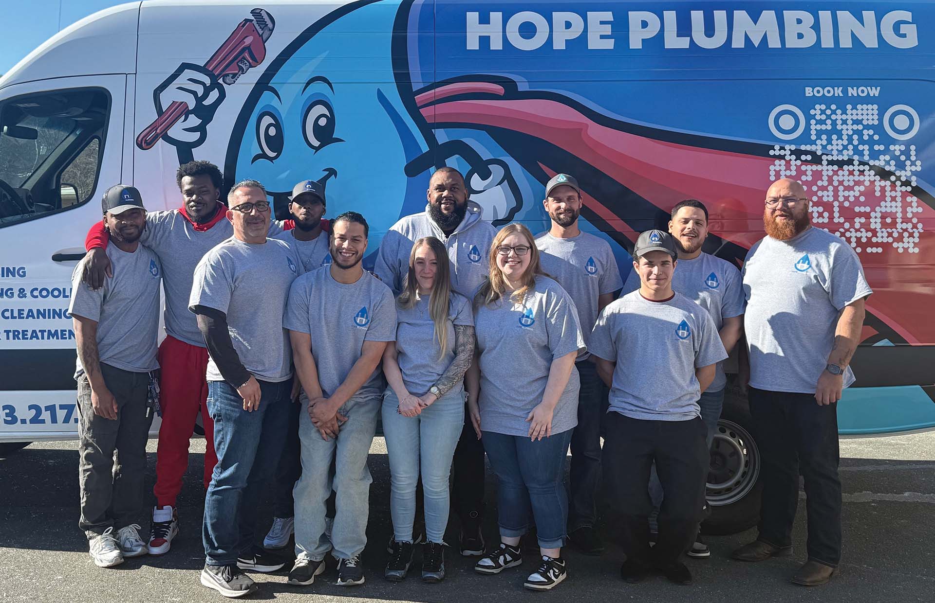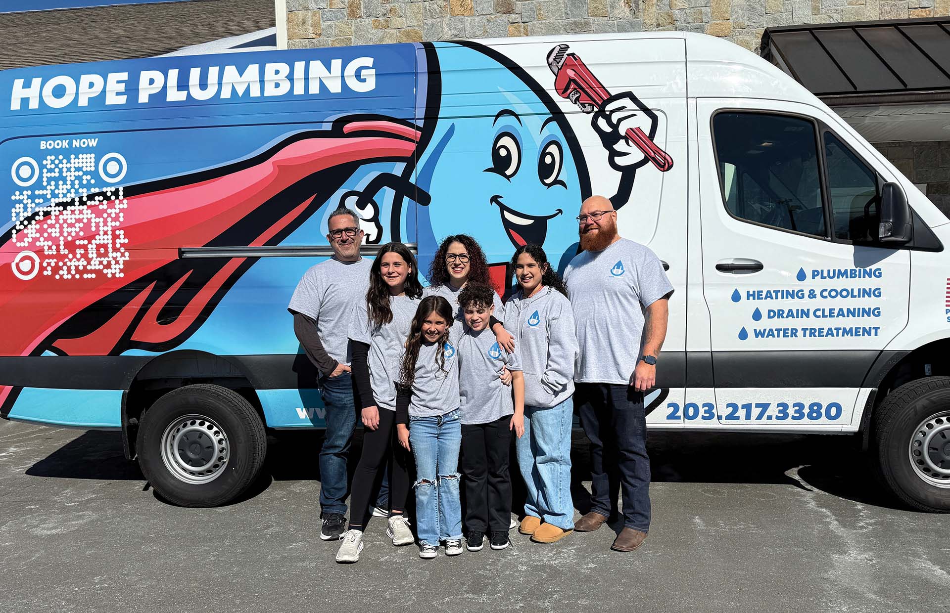 A family of six, all wearing gray uniform shirts, poses in front of a Hope Plumbing service van decorated with a large water drop mascot carrying a wrench. A family of six, all wearing gray uniform shirts, poses in front of a Hope Plumbing service van decorated with a large water drop mascot carrying a wrench.A family of six, all wearing gray uniform shirts, poses in front of a Hope Plumbing service van decorated with a large water drop mascot carrying a wrench.A family of six, all wearing gray uniform shirts, poses in front of a Hope Plumbing service van decorated with a large water drop mascot carrying a wrench. -
