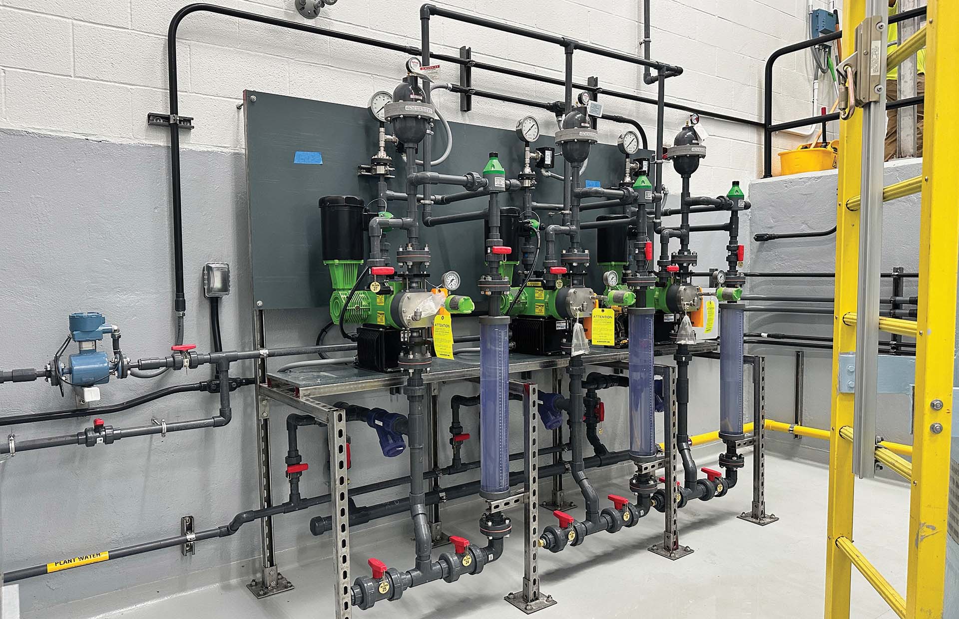 A water treatment or chemical dosing system featuring multiple green pumps, gray PVC piping, flow meters, and gauges, all mounted on a metal frame against a white and gray industrial wall. A water treatment or chemical dosing system featuring multiple green pumps, gray PVC piping, flow meters, and gauges, all mounted on a metal frame against a white and gray industrial wall.A water treatment or chemical dosing system featuring multiple green pumps, gray PVC piping, flow meters, and gauges, all mounted on a metal frame against a white and gray industrial wall.A water treatment or chemical dosing system featuring multiple green pumps, gray PVC piping, flow meters, and gauges, all mounted on a metal frame against a white and gray industrial wall. -