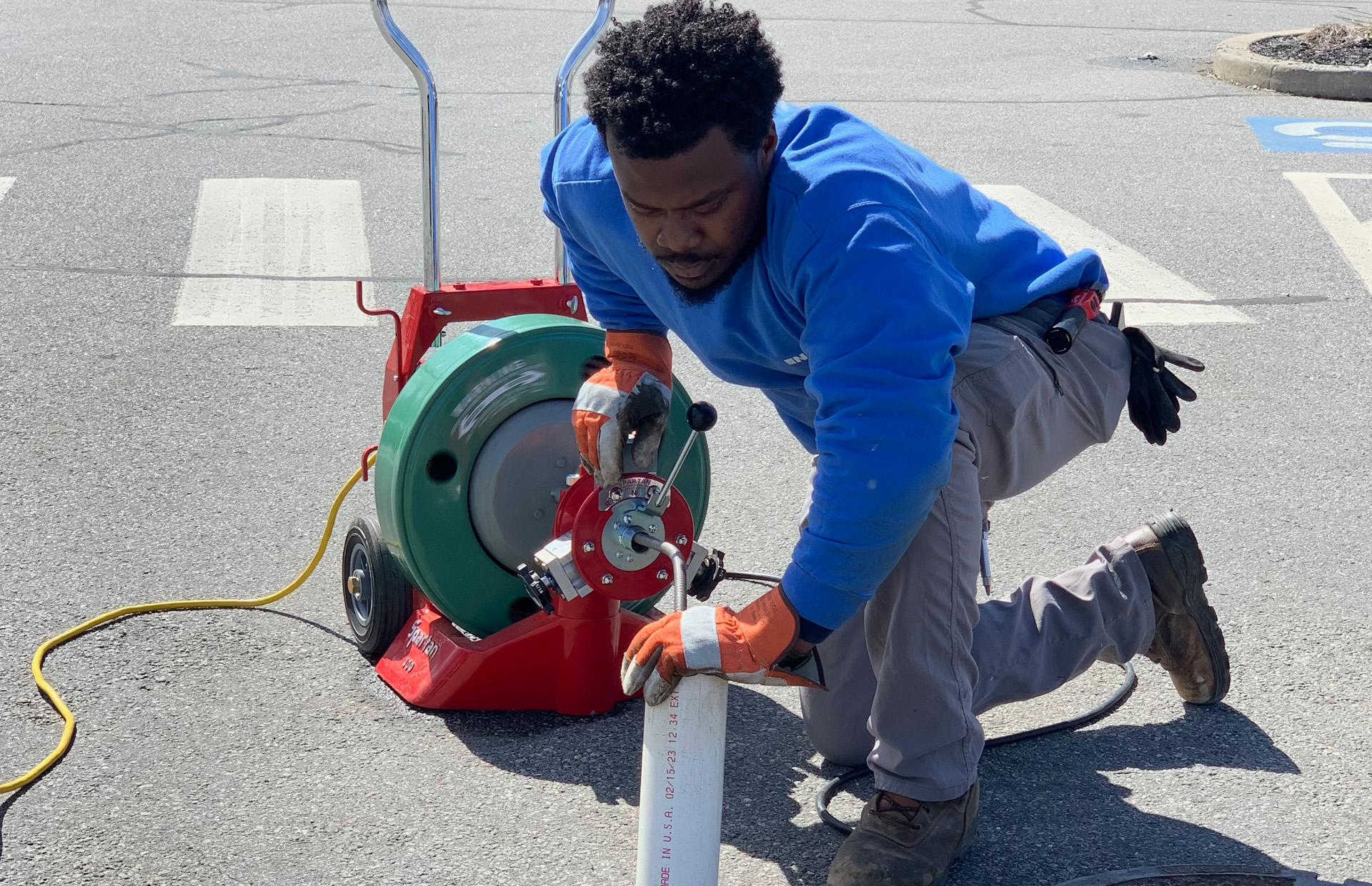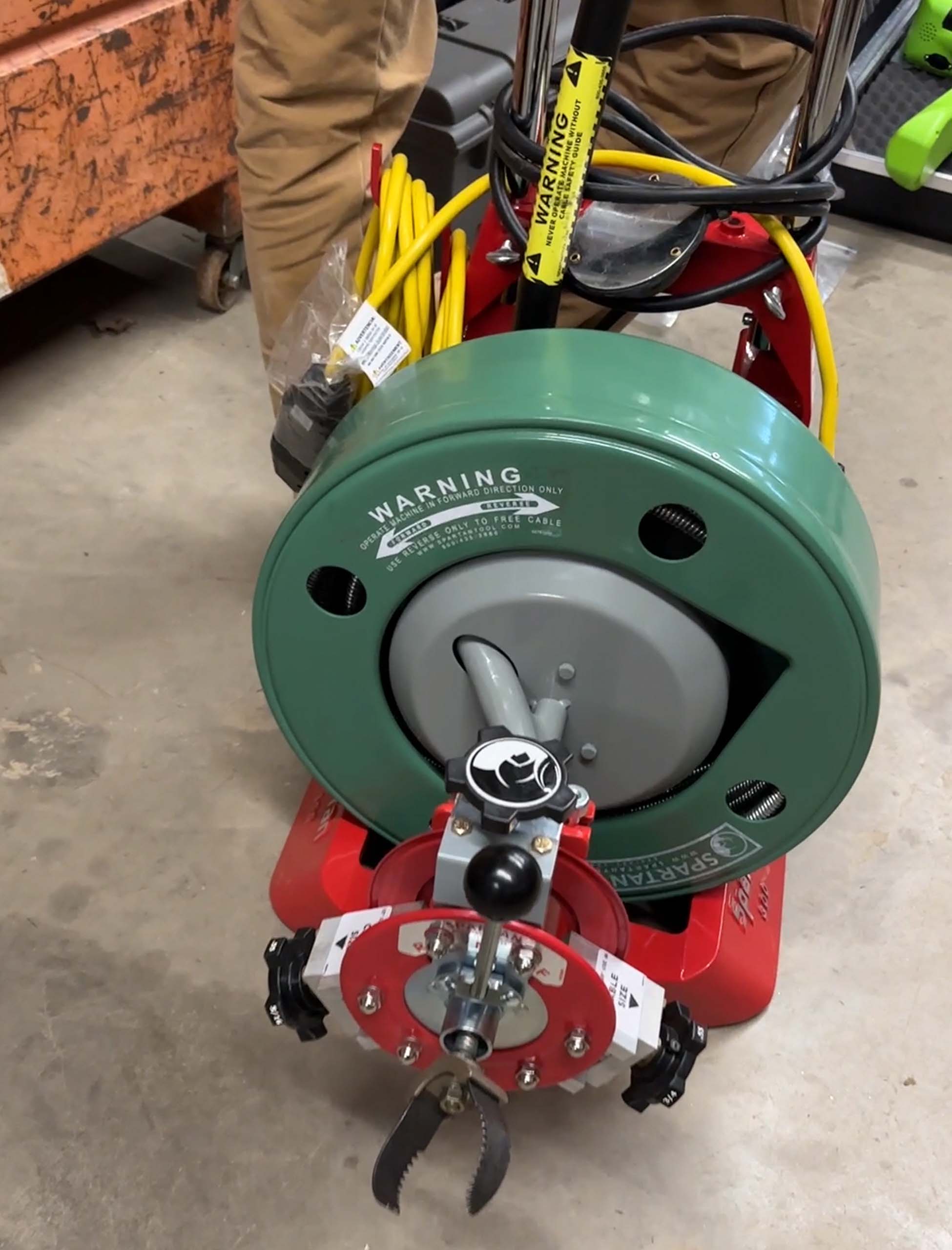 A close-up of a Spartan drain cleaning machine with a green drum and red frame, showing the coiled yellow cable and an attached root-cutting blade tool on the front. A close-up of a Spartan drain cleaning machine with a green drum and red frame, showing the coiled yellow cable and an attached root-cutting blade tool on the front.A close-up of a Spartan drain cleaning machine with a green drum and red frame, showing the coiled yellow cable and an attached root-cutting blade tool on the front.A close-up of a Spartan drain cleaning machine with a green drum and red frame, showing the coiled yellow cable and an attached root-cutting blade tool on the front.