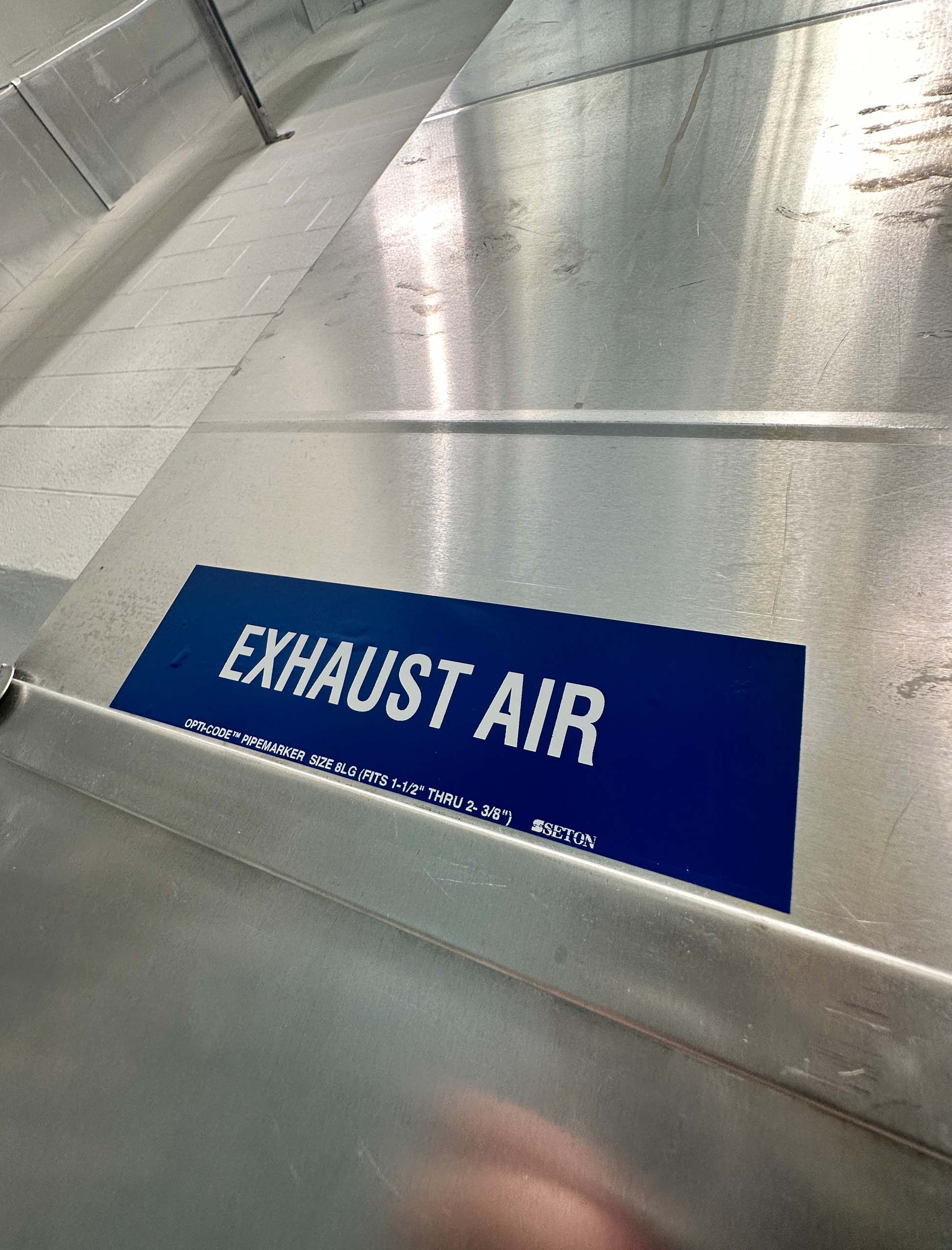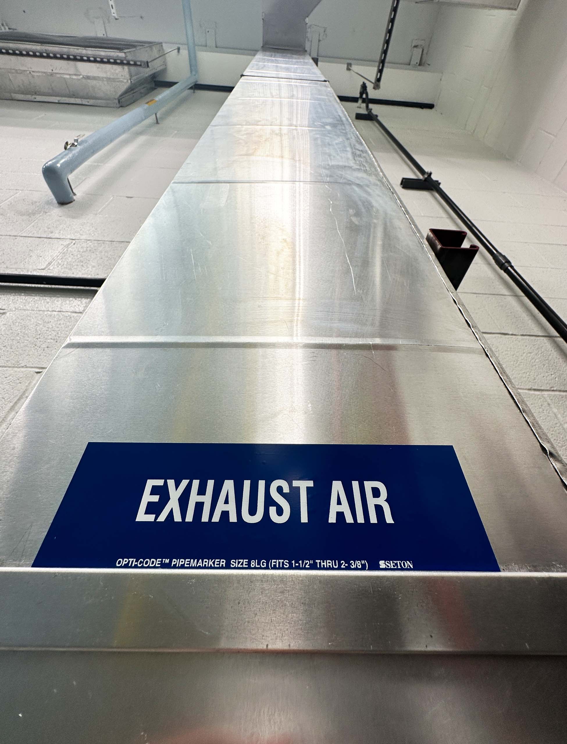 A low-angle view of a large, shiny, rectangular metal HVAC duct with a blue label reading 'EXHAUST AIR' running high across a white industrial ceiling. A low-angle view of a large, shiny, rectangular metal HVAC duct with a blue label reading 'EXHAUST AIR' running high across a white industrial ceiling.A low-angle view of a large, shiny, rectangular metal HVAC duct with a blue label reading 'EXHAUST AIR' running high across a white industrial ceiling.A low-angle view of a large, shiny, rectangular metal HVAC duct with a blue label reading 'EXHAUST AIR' running high across a white industrial ceiling. -