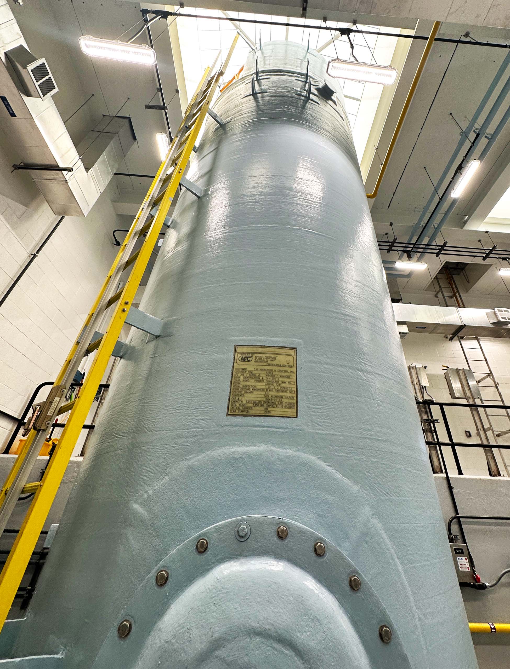 A low-angle shot of a tall, light blue industrial tank or pressure vessel with a yellow access ladder mounted on the side, stretching toward a skylight in the ceiling. A low-angle shot of a tall, light blue industrial tank or pressure vessel with a yellow access ladder mounted on the side, stretching toward a skylight in the ceiling.A low-angle shot of a tall, light blue industrial tank or pressure vessel with a yellow access ladder mounted on the side, stretching toward a skylight in the ceiling.A low-angle shot of a tall, light blue industrial tank or pressure vessel with a yellow access ladder mounted on the side, stretching toward a skylight in the ceiling. -